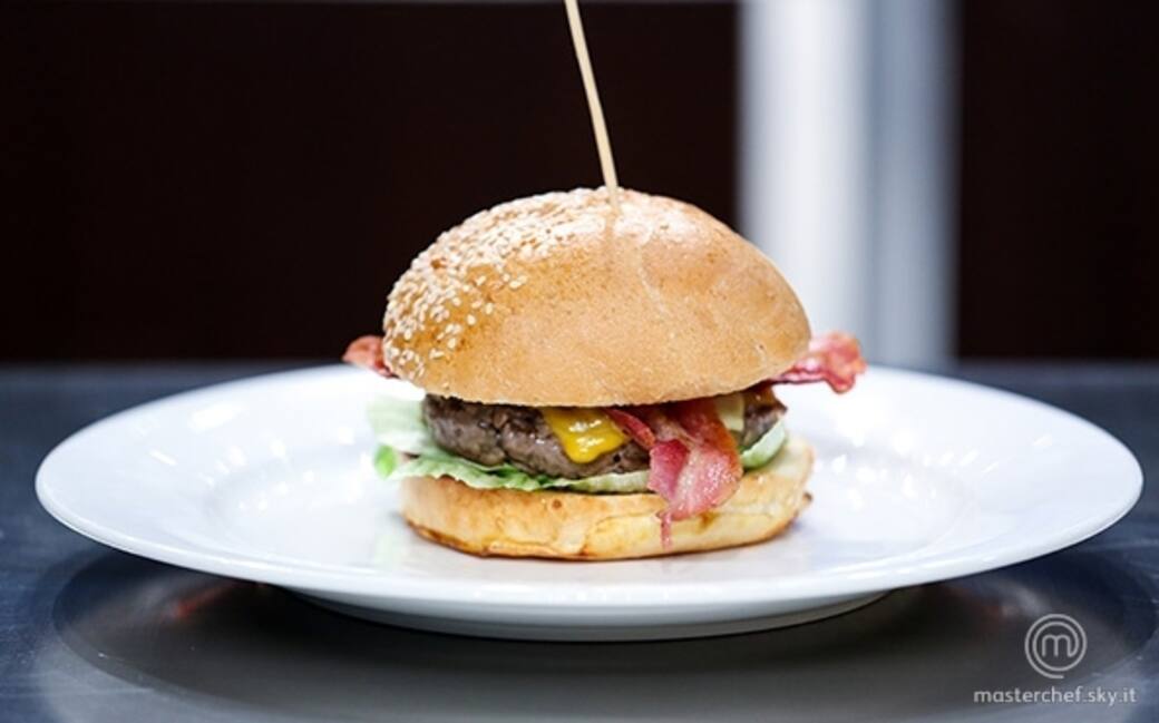 Impiattare mettendo pane, insalata, hamburger con il formaggio, bacon, cipolla e pomodoro precedentemente affettati.