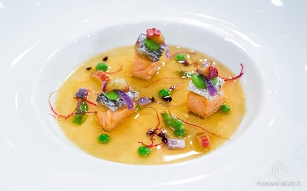 Impiattare in una fondina il brodo, adagiare al centro i dadini di salmone e aggiungervi sopra la composta di fichi e la pelle del salmone. Aggiungere in tutto il piatto le verdure sbianchite.