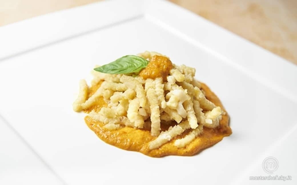 Passare l’impasto in parte con il ferro per i passatelli e la restante parte con lo schiacciapatate. Tagliarli della dimensione con cui verrà tagliato il baccalà, 4 centimetri circa con un coltello affilato. Prendere i passatelli e cuocere per massimo due minuti nella pentola in acqua bollente salata (già sul fuoco). Scolare i passatelli dalla pentola quando verranno in superficie aiutandosi con una schiumarola. Passare i passatelli direttamente nella padella del baccalà (sul fuoco accesa) e spadellare delicatamente.