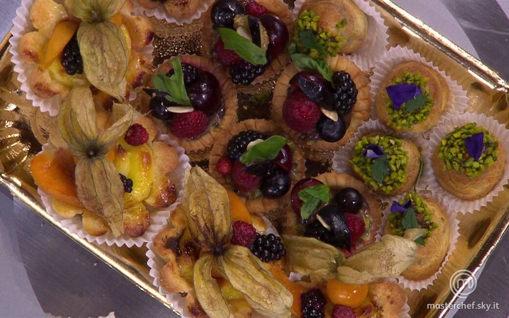 Comporre altre tartine sempre con la pasta frolla, la composta di pesche alla base e la crema mista sopra, cuocere in forno fino a doratura, decorare con frutta mista e una spolverata di liquirizia.