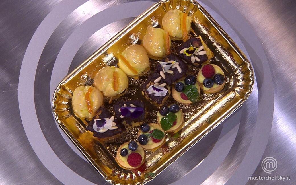 Farcire i bignè con la crema pasticcera, immergerli successivamente nel cioccolato bianco fatto sciogliere a bagnomaria e presentarli con una buccia candita in cima. Tagliare a quadratini la sbrisolona raffreddata, immergerla nel cioccolato fondente precedentemente sciolto a bagnomaria e presentarli con qualche pinolo tostato in cima.