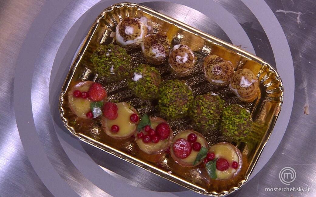 Nel frattempo mescolare in una pentola dei kiwi sbucciati, lo sciroppo di glucosio, il maraschino e l'agar agar (sciolto in acqua bollente); filtrare il liquido ottenuto per eliminare i semi del kiwi e stendere il tutto in una teglia da riporre in abbattitore, fino ad ottenere una gelatina consistente. Ritagliare dei cerchi di gelatina e stenderli sui pasticcini. Guarnire con le fragole e il ribes.
