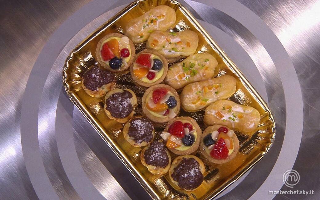 Comporre gli eclaire con la crema alla pesca, decorare con ghiaccia, cubetti di arancia candita e granella di pistacchi. Riempire i bignè con la crema al cioccolato, glassare con cioccolato fuso e spolverare con cocco rapé. Riempire le tartellette con la crema al limoncello, decorare con frutta fresca, mandorle a lamelle e finire con la gelatina di frutta.