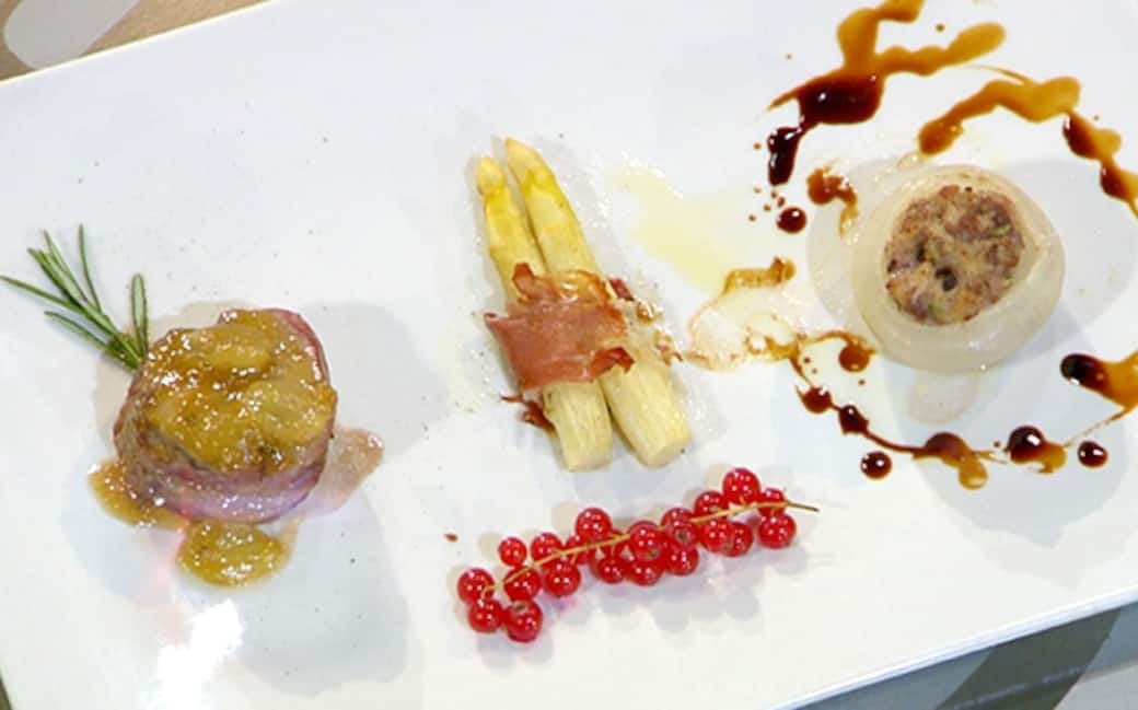 Disporre gli asparagi con lardo e prosciutto precedentemente riscaldati in forno e per ultima la cipolla, assieme ad alcune gocce di aceto balsamico di Modena. Decorare con un rametto di ribes rosso.