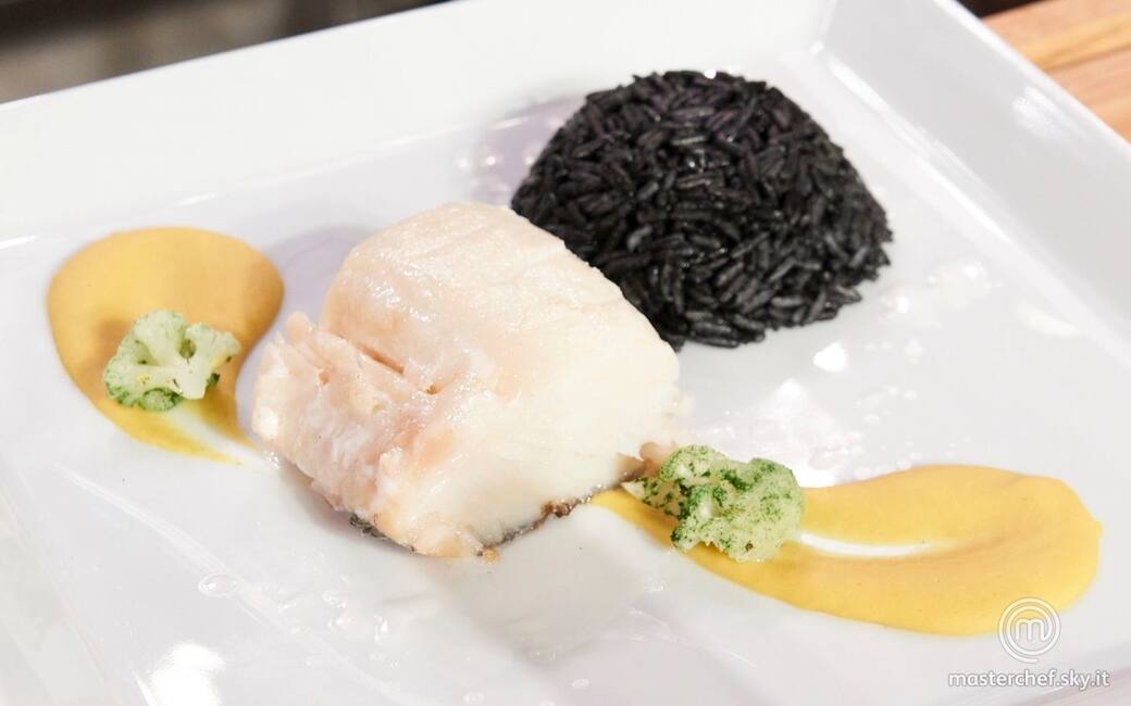 Coppare il riso con delle coppette tonde, adagiare la crema di cannellini e quella al latte di cocco, il filetto di baccalà e qualche cima di cavolfiore. Aggiustare di sale e pepe.
