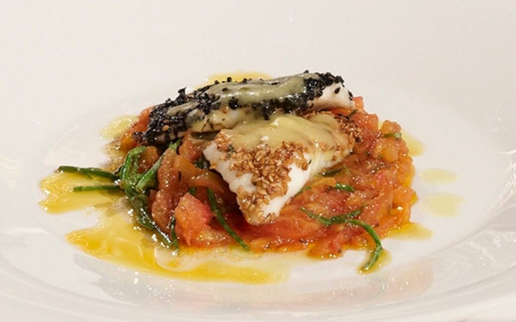 Mettere sul fuoco un’altra padella con l’olio e aggiungere i filetti di pomodoro con il timo. Far rosolare per 1 minuto, salare e aggiungere gli asparagi di mare.