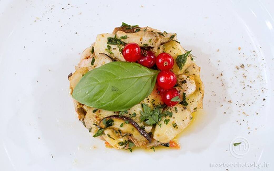 Formare un tortino di più strati: il primo realizzato con un cucchiaio di senape e le verdure, il secondo con le rane, l’ultimo con i funghi. Decorare il piatto con i ribes. Servire.