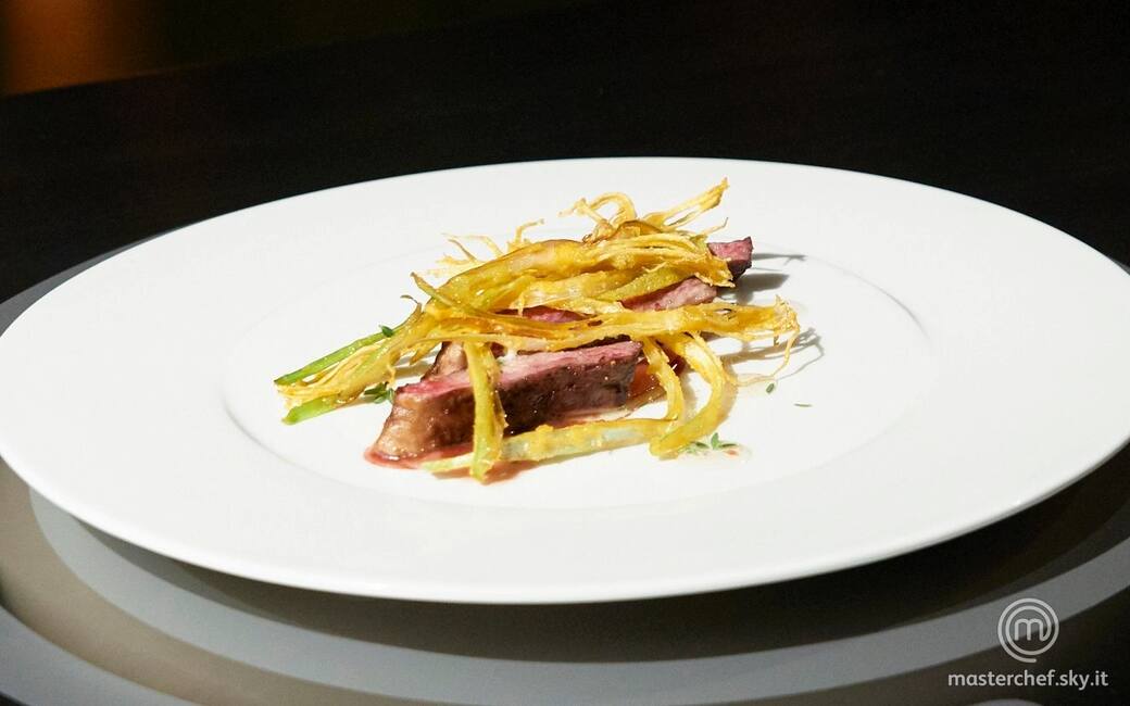 Rosolare il diaframma con uno spicchio d’aglio e del timo, far riposare e finire in forno per circa 2 minuti. Friggere i porri creando una rete di cipollotti e salare.