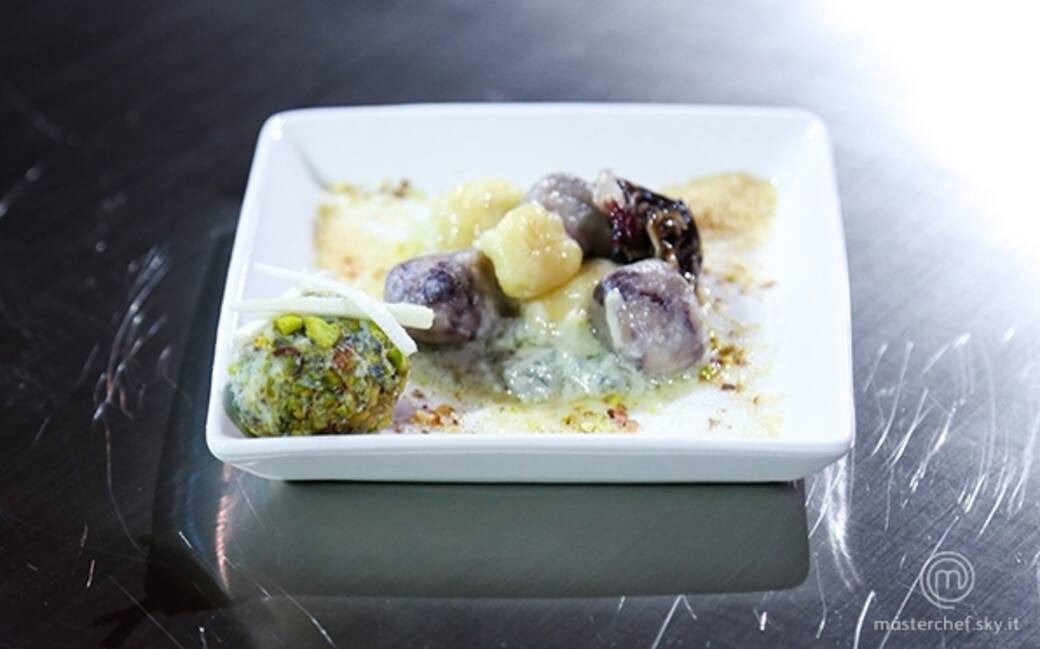Sciogliere il gorgonzola piccante con una noce di burro e un goccio di panna. Tagliare il radicchio precoce avanzato a forma di spaghetto, possibilmente senza i suoi costoni bianchi, caramellarlo in padella con burro, zucchero di canna e miele al peperoncino. Tritare i pistacchi tostati e salati e tagliare una prugna essiccata.