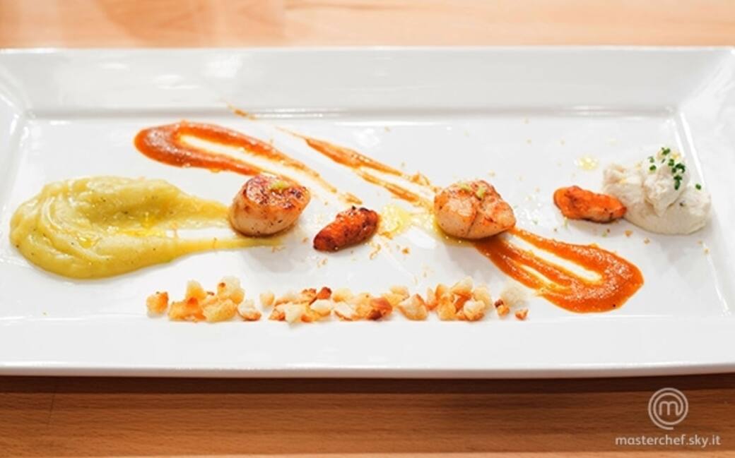 Impiattare posizionando in ogni piatto due quenelle di ricotta, la crema di patate, il chutney di datterini, due capesante e i relativi coralli. Aggiungere una grattugiata di wasabi, di limone e un filo d'olio extra vergine. Aggiungere al lato frisella sbriciolata.