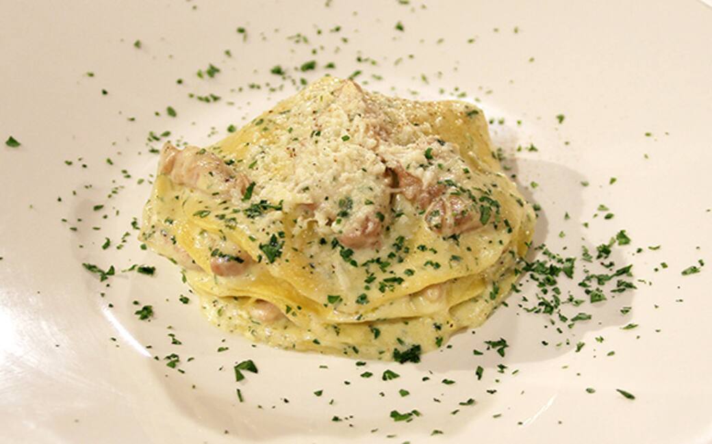 Sbattere le uova con una forchetta, formare una fontana con la farina, unire le uova, il sale e impastare. Avvolgere il composto con pellicola e far riposare. Tirare la pasta e tagliarla a quadrati.