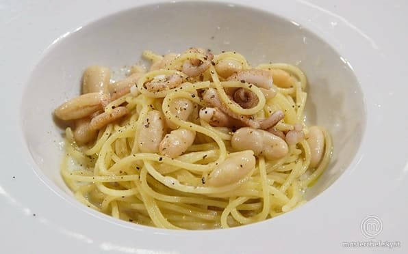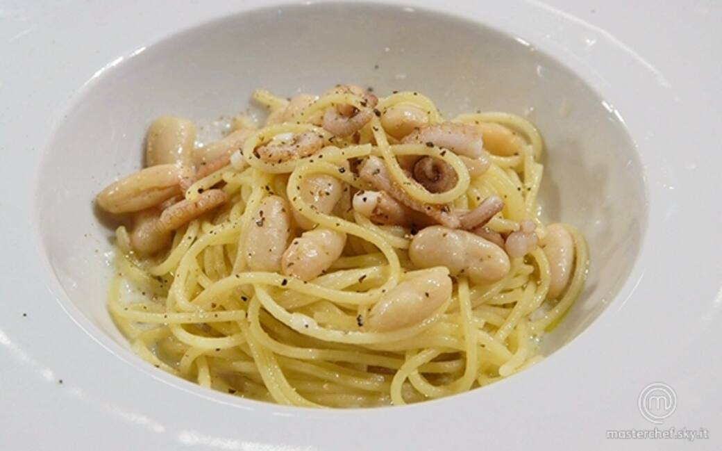 Aggiungere i fagioli cannellini ai tentacoli e condire con sale e pepe. Scolare gli spaghettini e farli saltare in padelle con i cannellini e i moscardini.