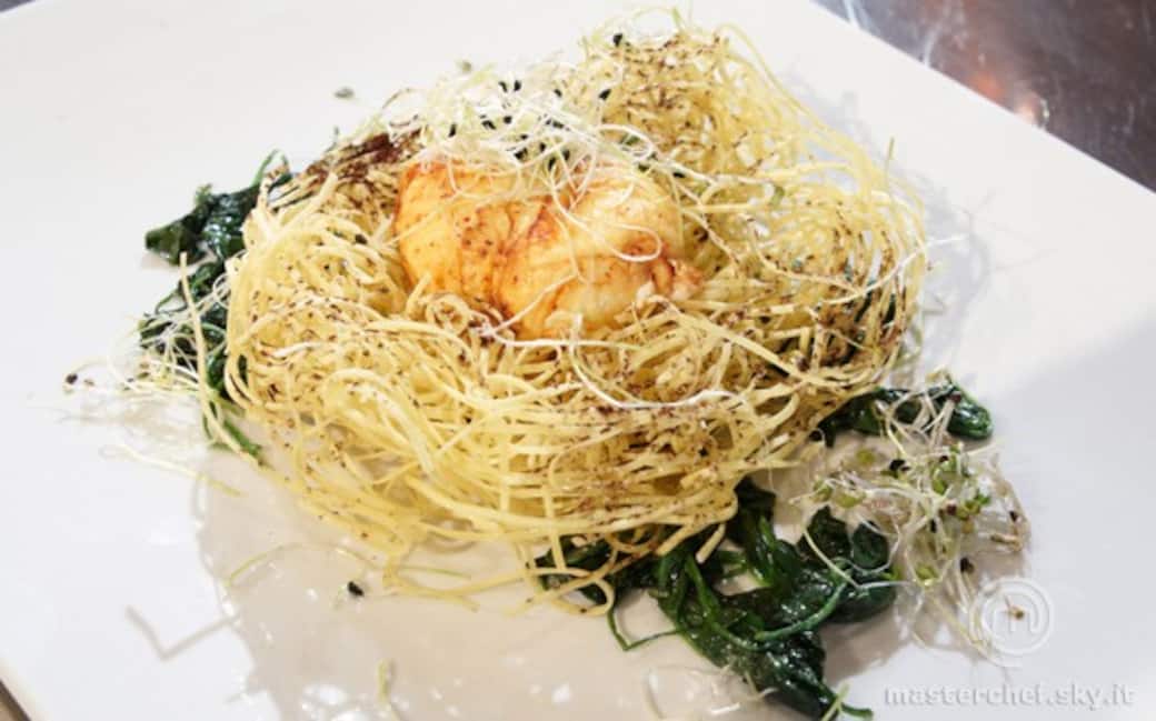 Comporre un nido con i tagliolini e successivamente friggerlo in olio bollente, cercando di tenerlo compatto. Scolarlo, salarlo leggermente e spolverarvi un po’ di cacao. Metterlo da parte.