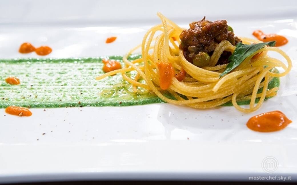 Scolare gli spaghetti, asciugarli bene con carta per la cucina e formare dei nidi. Scaldare l'olio di semi a 170 gradi e friggere il nido, finché non sarà ben dorato e croccante. Scolare, asciugare bene con carta cucina e salare.