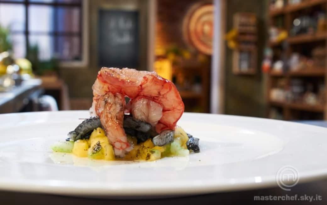 Impiattare: sul fondo mettere l’ananas e il sedano, sopra la citronette (passata al colino), sopra la seppia arricciata, poi le listarelle e infine i gamberi. Sopra i gamberi dell’altra citronette. Salare e pepare.