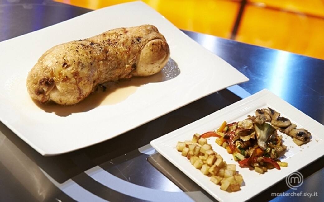 Mettere il pollo ripieno su carta forno e cuocere in forno in modalità ventilato per 30 minuti, poi passare alla modalità grill finché non si sarà formata una crosticina sulla superficie. Una volta lievemente intiepidito tagliare il pollo farcito a fette di circa 1 centimetro e 1/2 e servire accompagnato dal contorno di verdure.