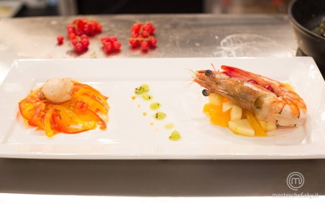 Aprire le capesante, togliere il mollusco dalla conchiglia, eliminare la frangia color nocciola e lavare sotto l’acqua corrente la “noce” (muscolo bianco) e il “corallo” (parte arancione). Pulire i gamberi. Marinare le capesante e i gamberi in olio, limone, sale e zenzero.
