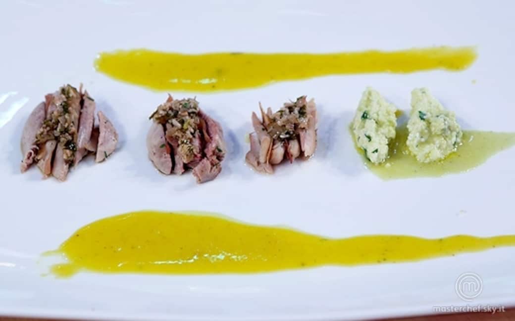 Usare il composto di scalogno, funghi, pinoli e prezzemolo su ogni porzione di quaglia. Frullare il formaggio con del prezzemolo e e versare la crema filtrata di fave e uva sul formaggio.