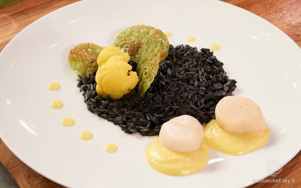 Impiattare disponendo un letto di riso al nero di seppia, la crema di cavolfiore con sopra le capesante, le cimette di cavolfiore e le chips di spinaci. Aggiustare di sale.