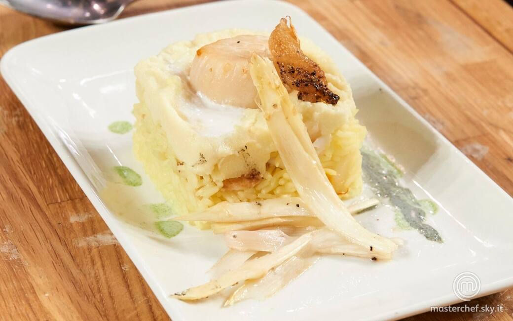 Impiattare con l’ausilio di un coppapasta quadrato: adagiare uno strato di riso, uno strato di baccalà, uno strato di riso e uno strato di purea di cavolfiore. Completare con la capasanta al forno, il lardo croccante e la julienne di asparago. Bagnare con poco latte di cocco e aggiustare di sale e pepe.