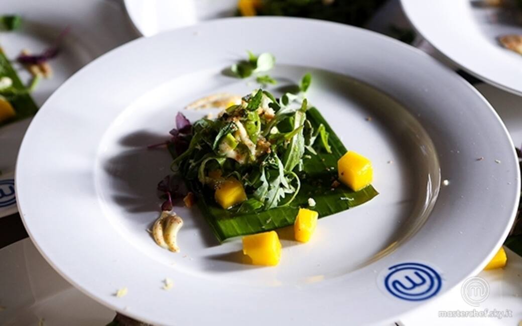 Impiattare ponendo alla base un quadrato di foglia di banano, taccole e julienne, una quenelle di polpa di gransevola, il mango, la menta, la maionese al corallo e germogli e completare il piatto.