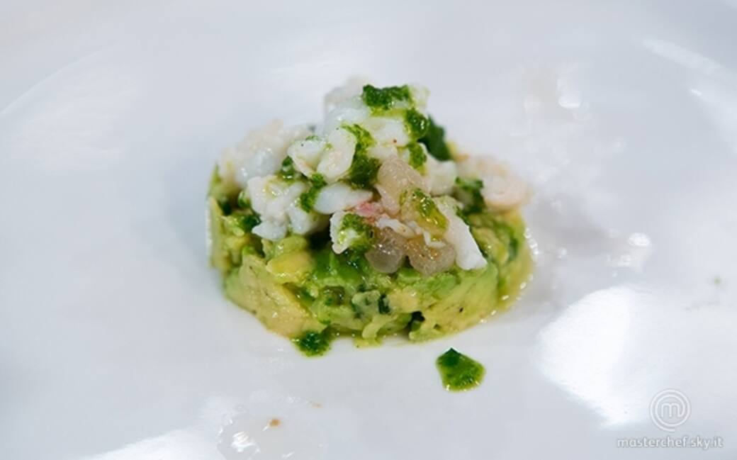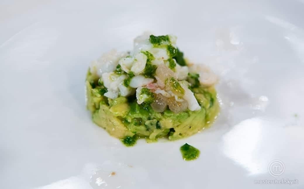 Con l'aiuto di un coppa pasta, mettere sul fondo del piatto l'avocado, adagiare quindi lo scampo con il lardo saltato e condire col pesto di acetosella e zenzero.