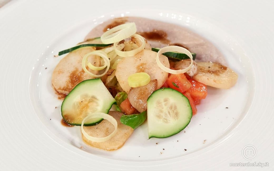 Tagliare i finocchi a fettine. Tagliare i cetrioli e il porro a rondelle. Tagliare il pomodoro a concassé. Tagliare la patata americana a rondelle, sbollentarla in abbondante acqua salata per qualche minuto, scolarla e friggerla in una padella con una noce abbondante di burro.