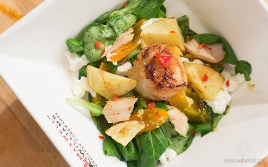 Mescolare la ricotta con habanero, sale e pepe. Cuocere le capesante e impiattare spargendo un po’ di habanero sull’insalata. Spezzettare la ventresca di tonno ed aggiungerla come decorazione.