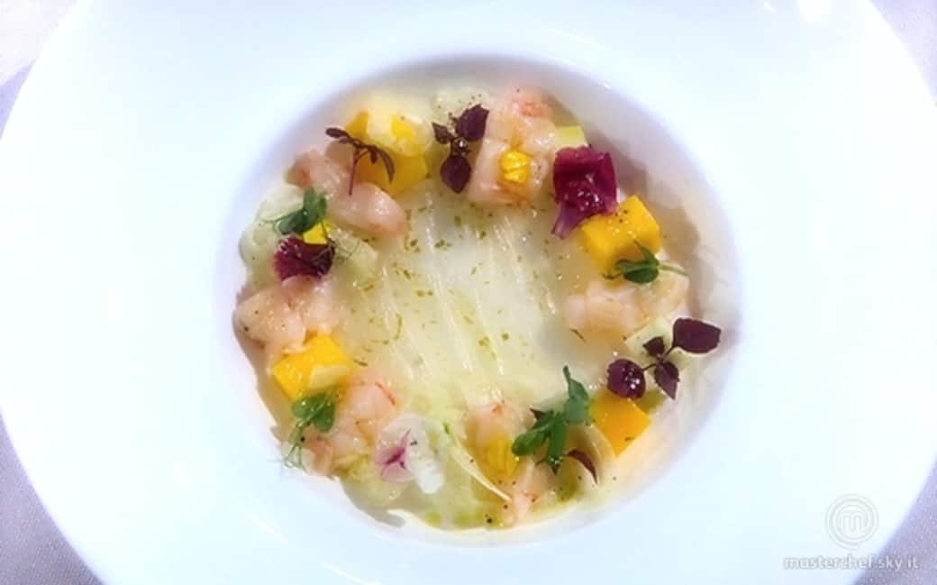 In una fondina, adagiare un disco di gelée di gin tonic e sopra di esso le chele dell'astice, sul bordo del piatto rispettando una metrica ordinata adagiare in sequenza i medaglioni di astice, i cubetti di mango e di mela verde, i fiori eduli e i germogli misti, condire il tutto con un filo d'olio e servire.