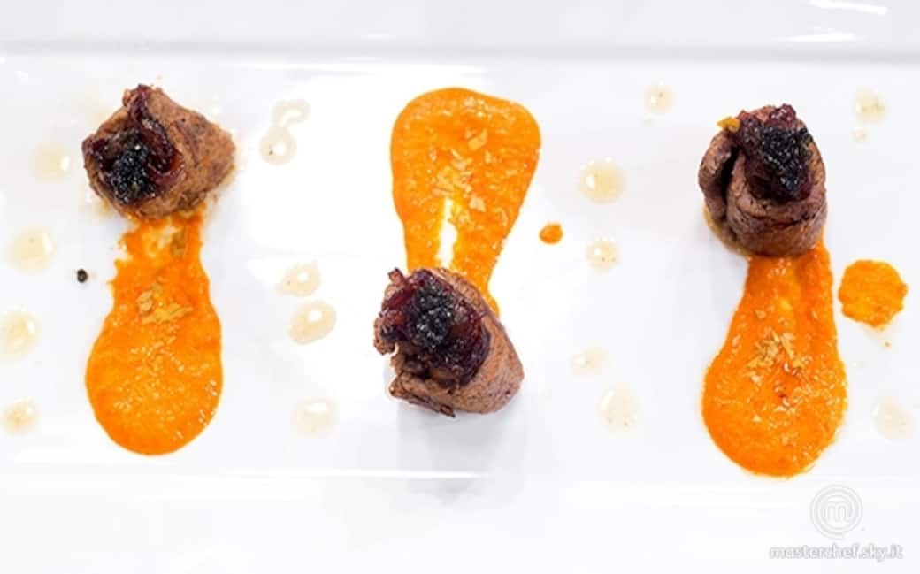 Mettere sul piatto la crema al peperone e adagiarvi sopra l'involtino. Completare con la rimanente cipolla e il caviale.