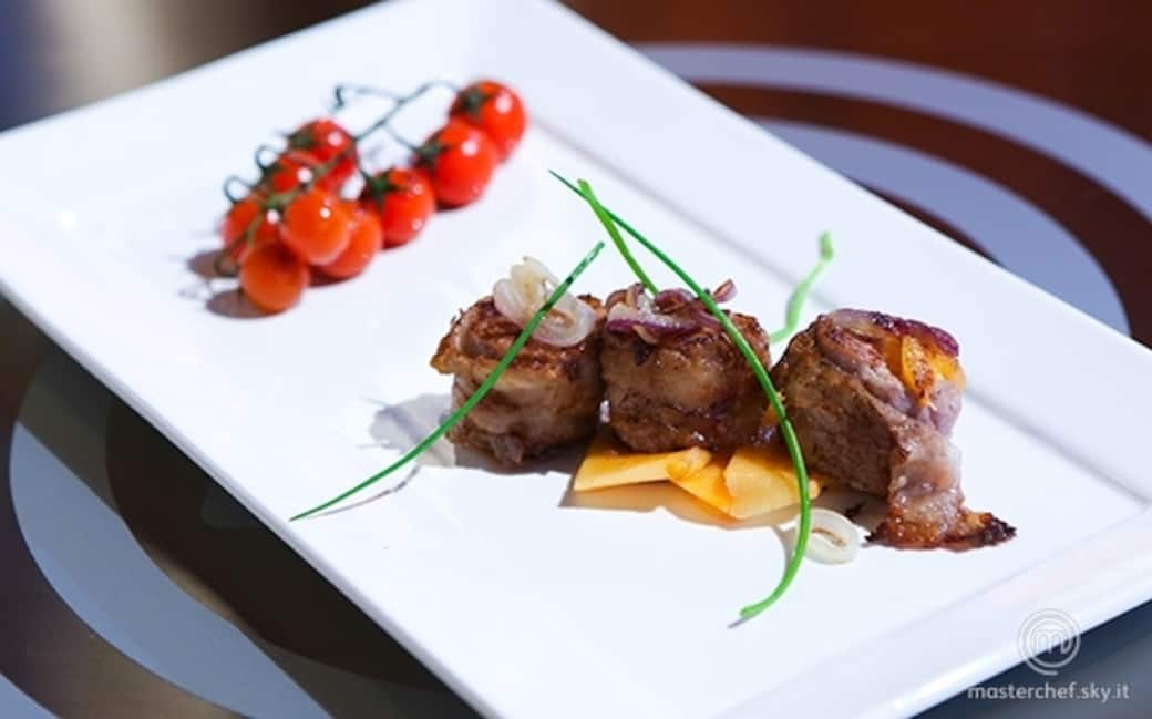 Impiattare disponendo tre fettine sottili di polpa di nespola come base e adagiando su 3 porzioni di involtino aggiustate di pepe. Disporre sopra ogni porzione un po' di julienne di cipolla appassita e un filo di erba cipollina. Decorare con un rametto di pomodorini scottati in padella.