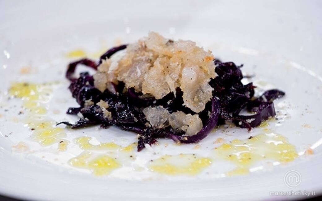 Tagliare a julienne il cavolo e cuocerlo in padella con olio e acqua.