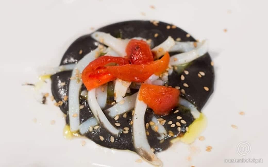 Mettere la salsa a specchio sul piatto e adagiarvi sopra la julienne di seppie e i pomodorini scottati e pelati e semi di sesamo.