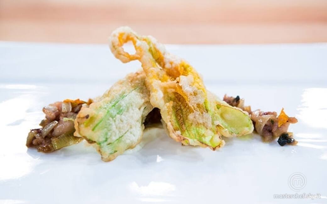 Impiattare mettendo sul fondo la salsa di sedano rapa, adagiarvi il ragù di quaglia, e infine le crocchette coperte dai fiori di zucchina fritti. Aggiustare di sale e pepe.