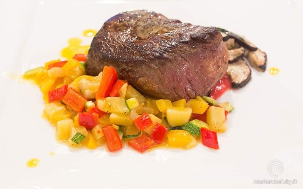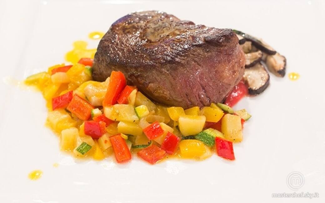 Versare la salsa a specchio sul piatto da portata, adagiarvi sopra il filetto e impiattare accanto le verdure e i funghi. Terminare con una macinata di pepe.