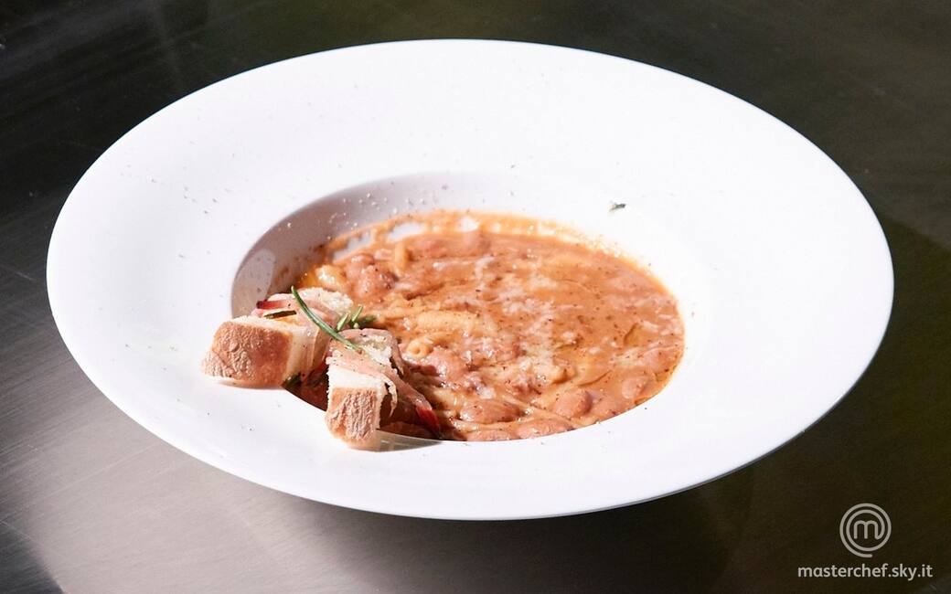 Impiattare la pasta e fagioli in una terrina e completare con i crostini di pane, listarelle di guanciale e un filo di olio evo. Aggiustare di sale e pepe.