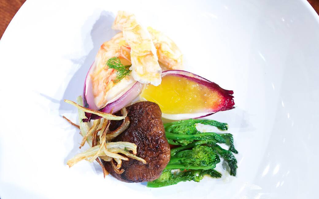Tagliare la cipolla in due parti per il lungo e condirla con qualche chicco di pepe, olio di oliva aromatizzato al finocchio e aglio, e cuocere in forno per 30 minuti a 180°C. Cuocere in forno anche i funghi puliti e conditi con lo stesso olio d'oliva aromatizzato, aggiungendo un cucchiaio d'aceto, un filo di miele, qualche chicco di pepe e alcuni pezzetti di cipolla adagiati sulla parte interna del fungo così da insaporirlo e non farlo asciugare.