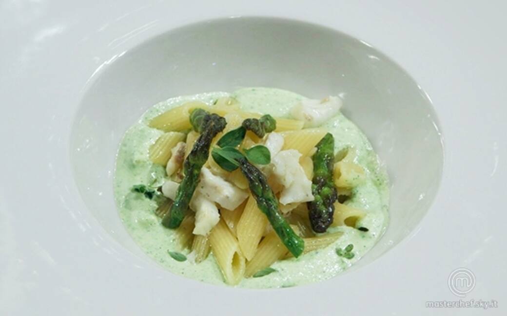 Con l’aiuto di una schiumarola, versare le mezze penne rigate in padella con gli asparagi e il rombo e saltare il tutto.