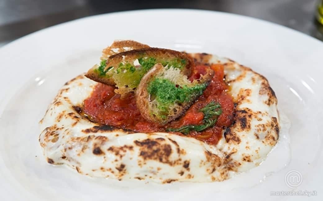 Con l'aiuto di un cannello bruciare il cornicione della pizza in modo da renderlo croccante e bruciacchiato: questo sapore darà il gusto della pizza alla mozzarella.