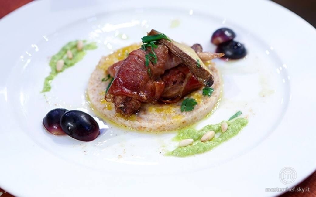 Impiattare il farrolatte al centro del piatto e adagiarvi sopra la quaglia. Decorare con il pesto di fave al latte e l'uva. Appoggiarvi sopra una fetta di fungo spadellata con aglio e prezzemolo e versare poca salsa a base di uovo e castelmagno.