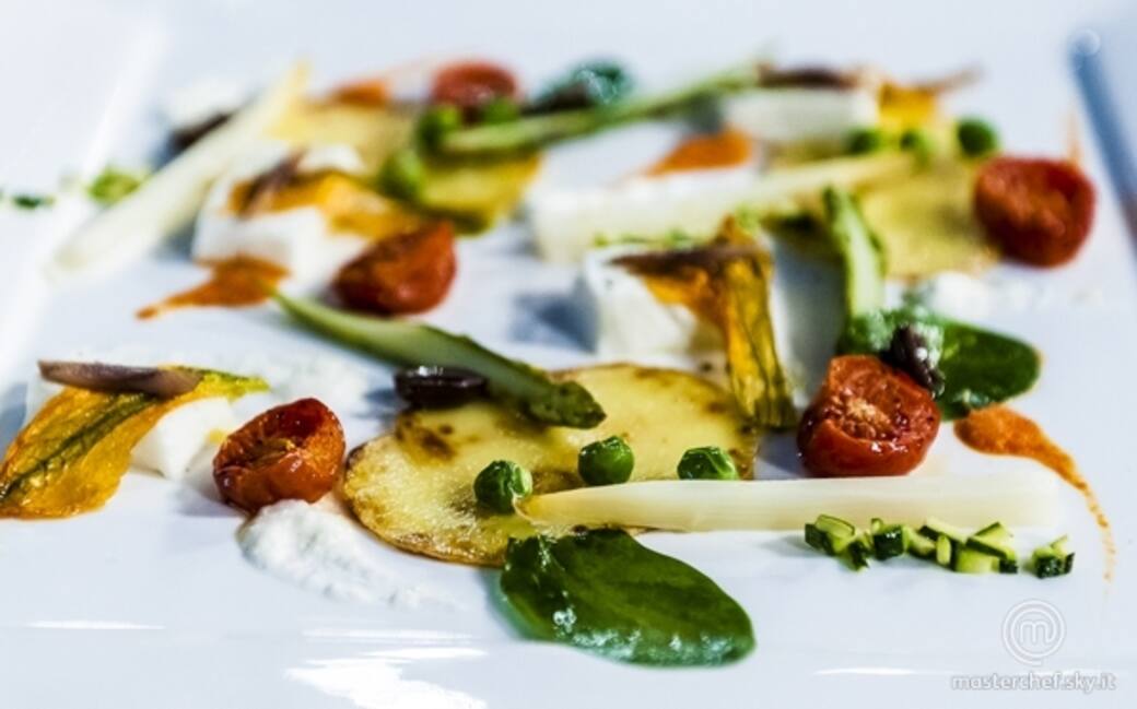 Posizionare le fettine di patate sul fondo, aggiungere tutte le verdure cotte, mettere su ogni rettangolo di mozzarella un filetto di fiore di zucca e un pezzetto di alice. Decorare con la crema di peperoni, la crema di mozzarella, le olive taggiasche, le foglioline di lattuga, la scorza grattugiata del limone e una macinata di pepe nero.