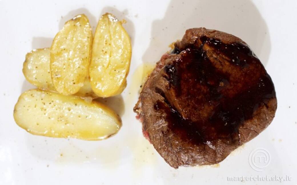 Ultimare la cottura delle patate nella padella nella quale sono stati cotti i filetti. Infine togliere il burro dalla padella e utilizzarla per fare una riduzione d’aceto balsamico.