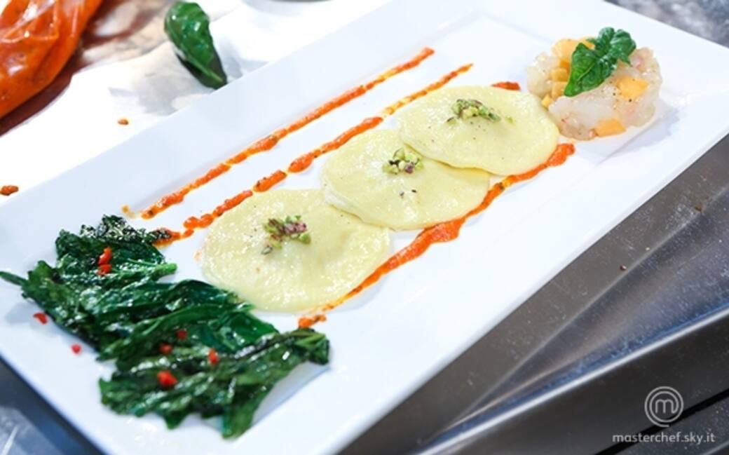 Stendere sul fondo del piatto cinque linee parallele di purea di pomodorini e peperoni; adagiarvi sopra i tre ravioli e a lato disporre la tartare di scampi e melone, decorando con delle foglioline di basilico. Dall'altra parte del piatto stendere le cime di rapa aggiungendo qualche cubetto di peperoncino fresco.
