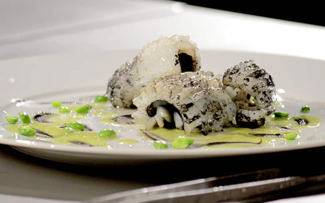 Nel frattempo lessare i piselli in acqua con cipollotti e sale, lasciarli cuocere per 30 minuti. Ridurre i piselli in crema, passarli con il colino e usare il tutto come fondo.