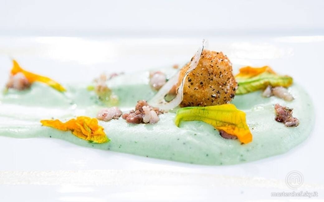 Arrotolare i filetti di sogliola a turbante, passarli in albume d'uovo e poi nel pangrattato. Friggere in olio di arachidi bollente. Impiattare con la crema di sedano, il ragù di quaglia, la sogliola fritta e alcune gocce del fondo di cottura dei porri all'aceto. Guarnire con piccoli pezzi di fiori di zucchina crudi.