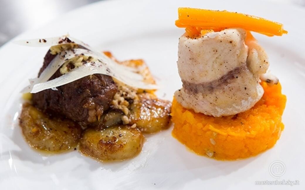 Assemblare il piatto aggiungendo scaglie di parmigiano spolverate di olio al cacao