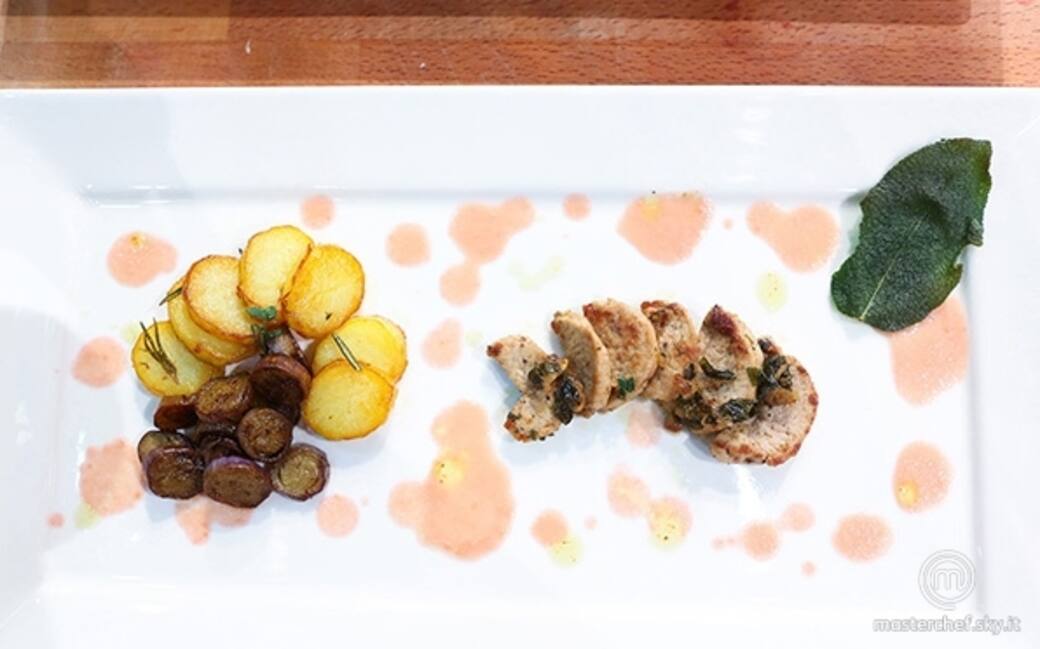 Impiattare disponendo da un lato le patate e le melanzante, dall'altro i testicoli di toro affettati e in un angolo la foglia di salvia fritta. Ultimare con la salsa di prugne.