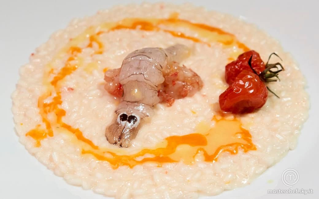 Soffriggere lo scalogno tritato con un filo di olio evo. Toglierlo e tostare il riso nella stessa padella. Sfumare con il vino bianco, aggiungere mestoli di brodo filtrato e portare a cottura. A pochi minuti dalla fine della cottura aggiungere la tartare di gamberi e canocchie e spegnere il fuoco. Mantecare con il burro a freddo e aggiustare di sale.
