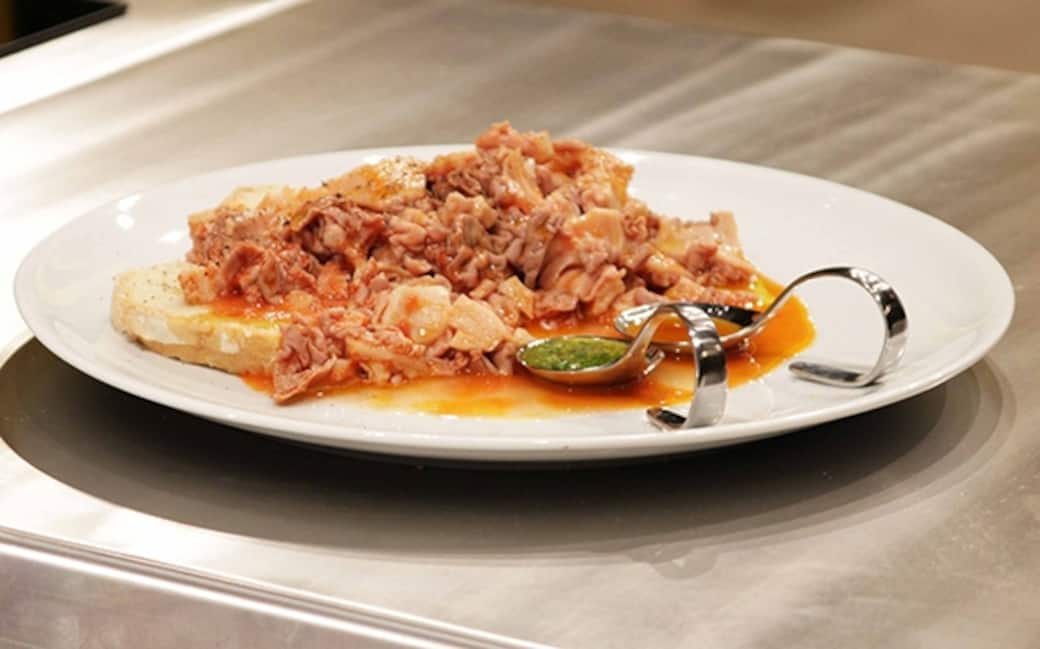 Fare insaporire il lampredotto, tagliarlo a piccoli pezzetti e servirlo con fette di pane tostato inzuppate nel brodo con l'aggiunta della salsa verde e di quella piccante.