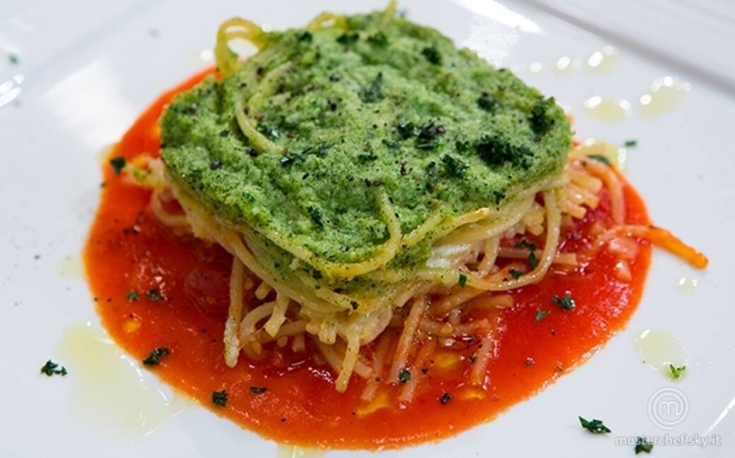 A parte, in una ciotola, preparare una crema setacciando il rimanente sugo. Servire avendo cura di posizionare la lasagna sulla crema di pomodoro liberandola con attenzione dal coppa pasta in cui è stata infornata.